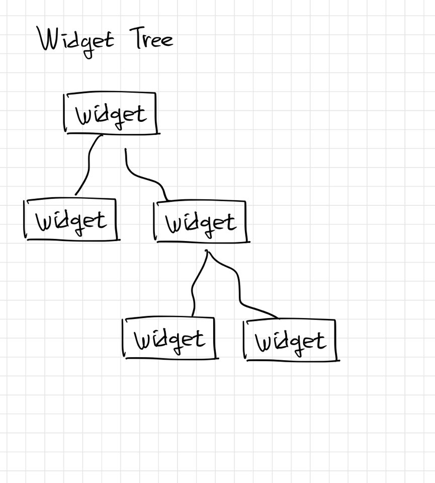 앞에서 말하였듯이 플러터는 위젯(요소)으로 이루어져 있다. 그리고 위젯은 위젯 트리를 가질 수 있다. 위젯 트리가 무엇이냐면 위젯 안에 자식개체의 위젯을 가지게 되어 나무가지처럼 뻗어나가는 것을 말한다. 그러니 그 자식들 또한 역시 자식을 가질 수 있으며 나무는 끝없이 뻗어나갈 수 있게 된다.