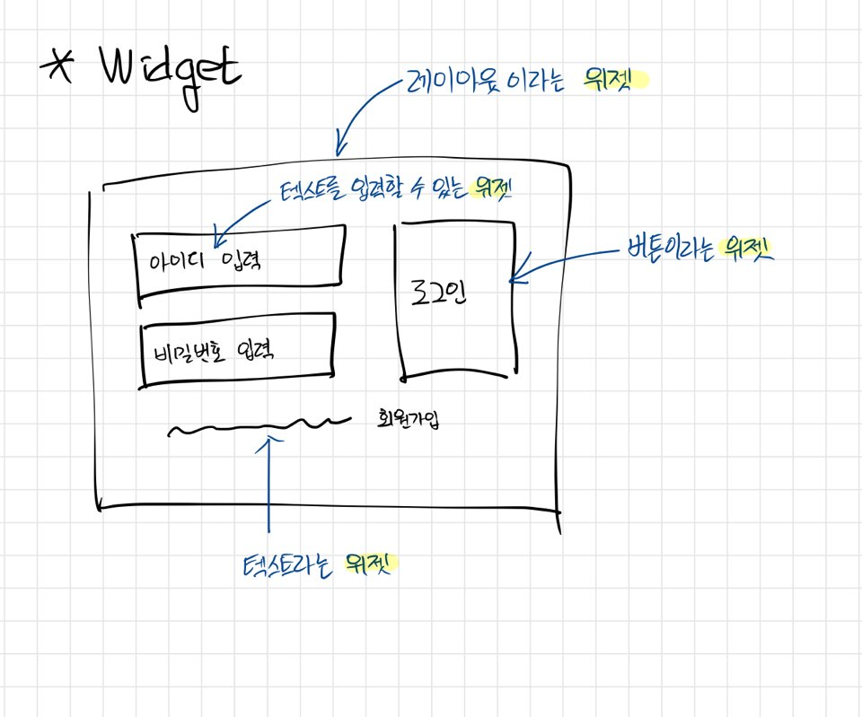 위젯에 대한 개념은 플러터에서 중요하지만 정의 자체를 이해하려고 긴 시간을 투자하는 것은 의미가 없을 것 같다. 위젯은 어떤어떤것이다 하고 정의 내리기보다는 이름 정도로 이야기하면 이해가 편할 것이다.