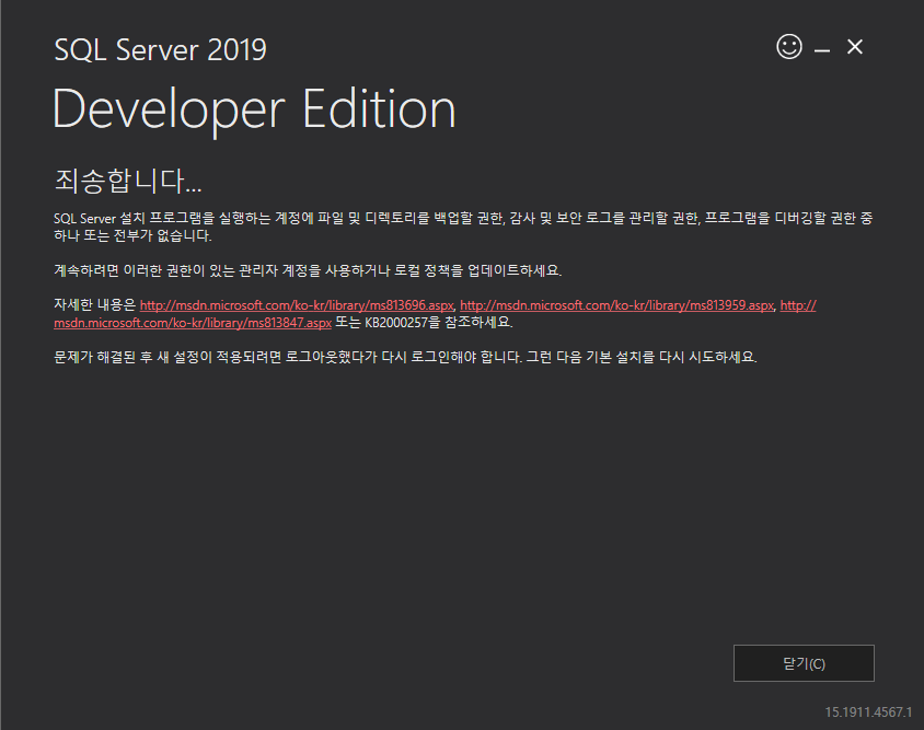 SQL Server 설치 프로그램을 실행하는 계정에 파일 및 디렉토리를 백업할 권한, 감사 및 보안 로그를 관리할 권한, 프로그램을 디버깅할 권한 중 하나 또는 전부가 없습니다. 오류 발생 시
