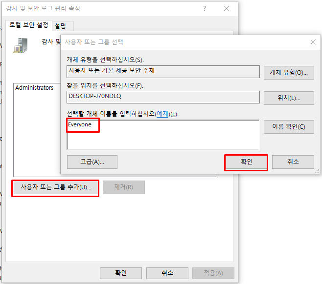 위 3개의 리스트를 각각 더블클릭 하여 Everyone 이라는 개체 추가