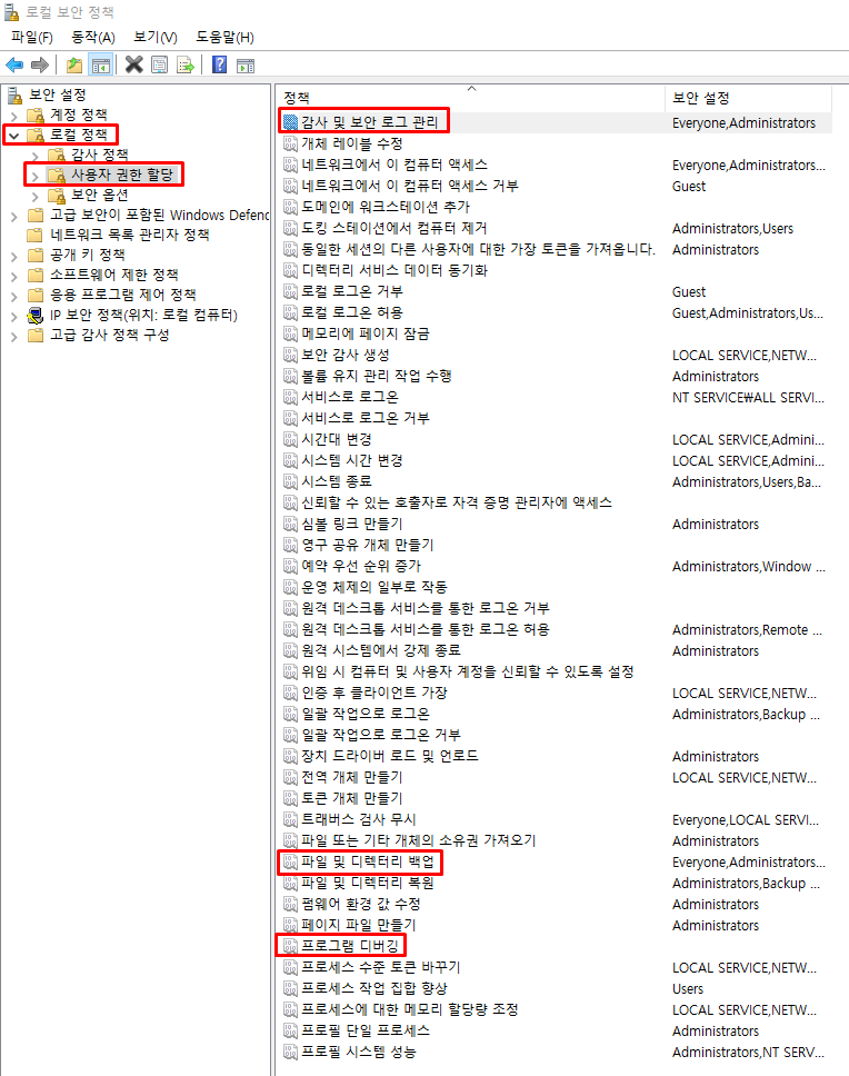 왼쪽의 보안 설정 > 로컬 정책 > 사용자 권한 할당 탭 선택