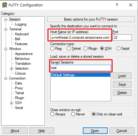 Host Name 에는 AWS에서 복사해두었던 주소를 입력하고 Saved Sessions 에서는 편한 이름을 적어두고 Save를 입력하자. Open에는 손을 올리지 않도록 한다.