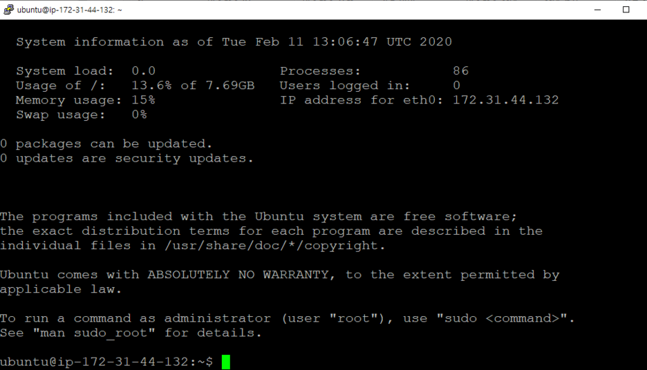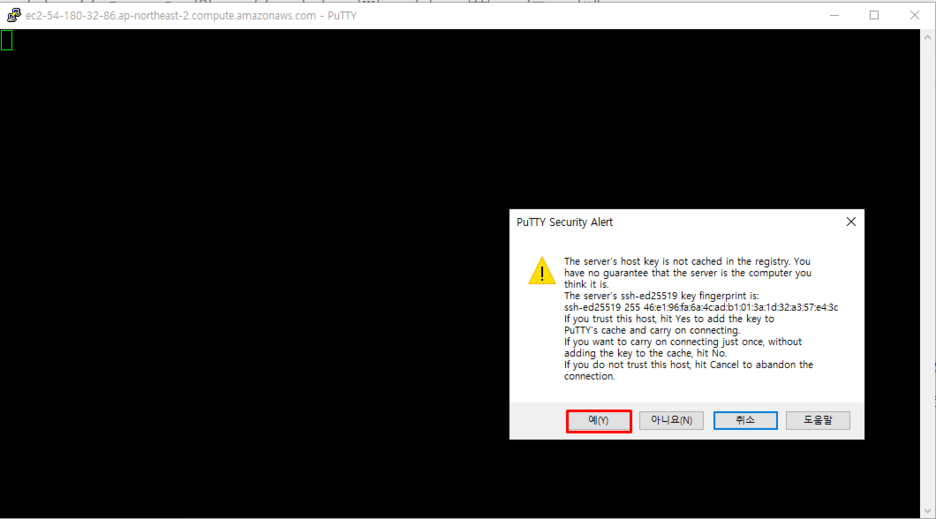 [예] 를 클릭하면 검은 화면에 login as: 라는 글씨를 볼 수 있다. ubuntu를 입력하면 리눅스 세상에 입장이 가능하다.