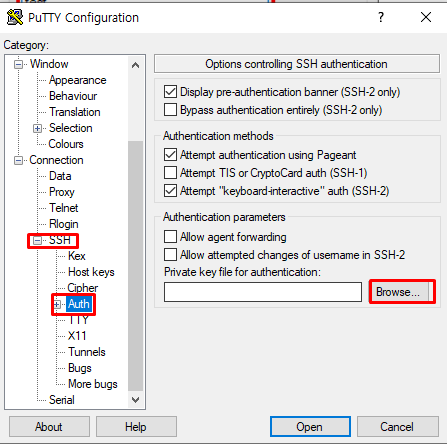왼쪽 카테고리에서 SSH 하위에 Auth를 선택하고 Private key file for authentication 항목에 변환해둔 ppk 파일을 입력하자. Open에는 손을 올리지 않도록 한다.