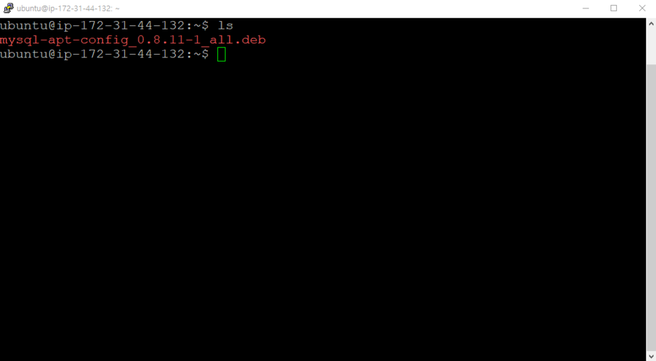 다운로드 명령을 실행 후 ls(list 보기 명령)을 타이핑하면 빨간색으로 표시된 mysql 8.0버전의 deb 파일이 다운로드 된것을 확인할 수 있다.
