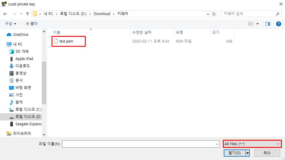 확장자를 All Files로 변경해야 pem 파일을 찾을수 있다.