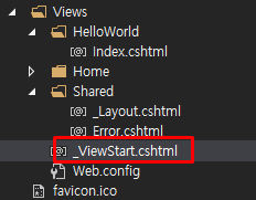 그이유는 Views폴더 내에 위치한 _ViewStart.cshtml 이 아래의 사진과 같이 공통으로 _Layout.cshtml 을 참조하도록 명시하고 있기 때문이다.