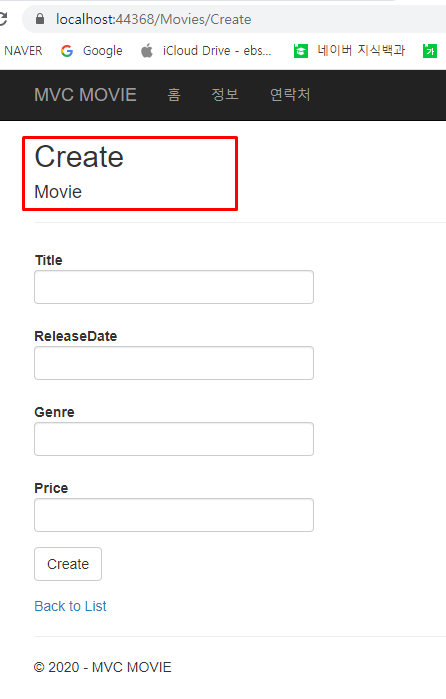 생성한 컨트롤러의 이름이 MoviesController 이기 때문에 Controller을 제외한 Movies를 주소에 입력하면 된다.