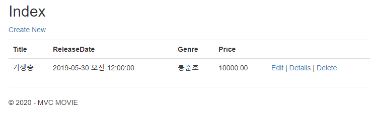 코드 안에는 Index, Details, Create, Edit, Delete의 함수가 View()를 리턴하는 것을 확인할 수 있다. View를 리턴하기 위해서는 View 페이지를 생성해주어야 하는데 Views 폴더에 가보면 Movies라는 폴더와 위에서 말한 함수와 같은 이름의 페이지들이 생성된 것을 확인할 수 있다.