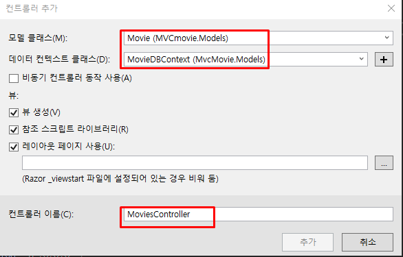 컨트롤러를 생성하면서 추가할 내용은 위와 같다.