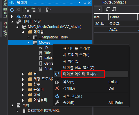 Movies라는 테이블이 생성되어 있고 테이블 데이터 표시를 누르면