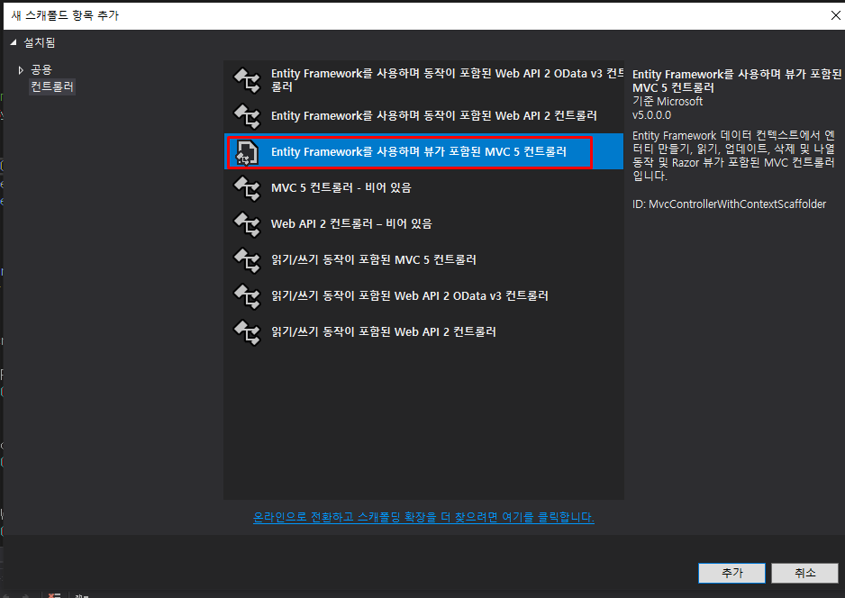 우리가 사용할 스캐폴드는 'Entity Framework를 사용하며 뷰가 포함된 MVC 5 컨트롤러'이다.